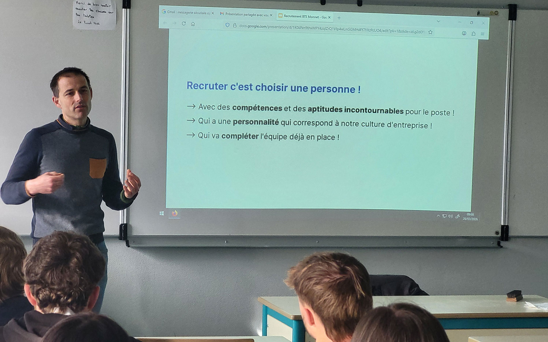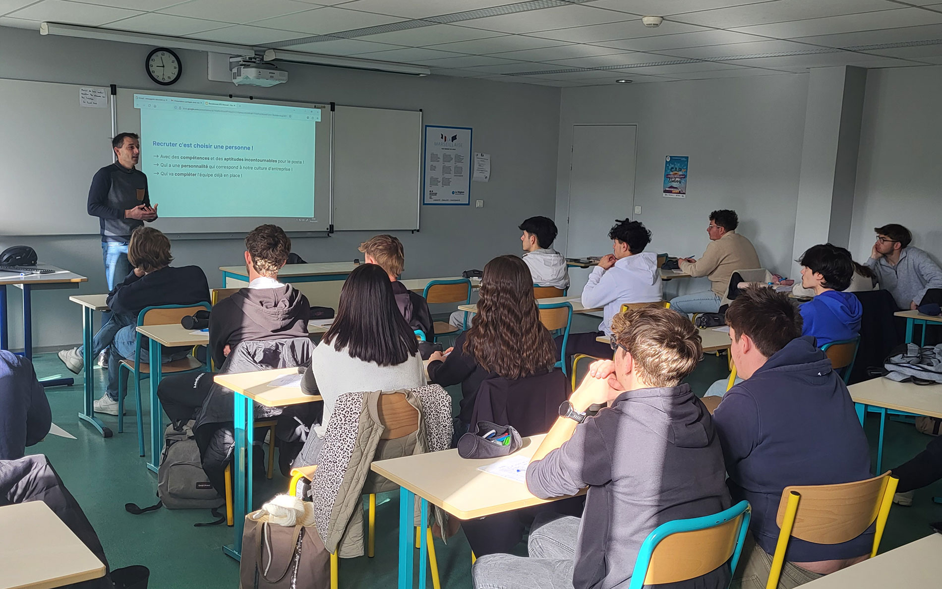 Cette intervention, sous la forme d’échanges avec les étudiants, a notamment permis à la classe de BTS de bien appréhender les enjeux de la politique de recrutement et d’intégration pour une enseigne. Grâce à leurs prises de notes, les étudiants auront ainsi pu recueillir de nombreuses informations, qu’ils pourront mobiliser dans le cadre de leurs prochains devoirs afin de préparer l’examen final du BTS en 2027.
