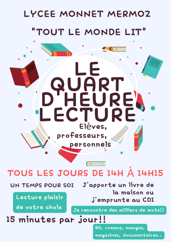 Le dispositif académique «Tout le monde lit ! » c’est 15 minutes de lecture quotidienne pour tous les élèves des établissements scolaires. Nous réitérons l’opération pour la 4ème édition au lycée Monnet Mermoz.
