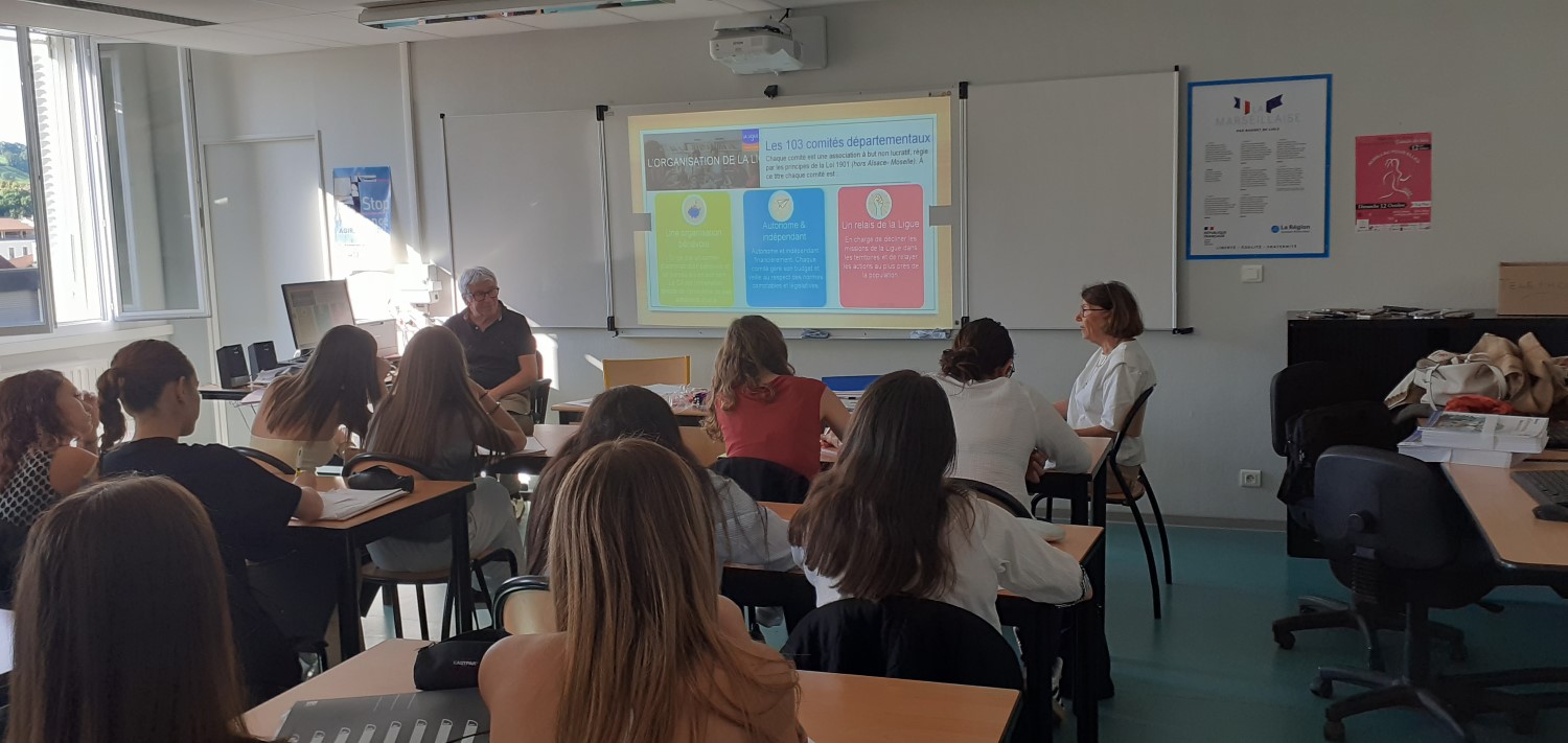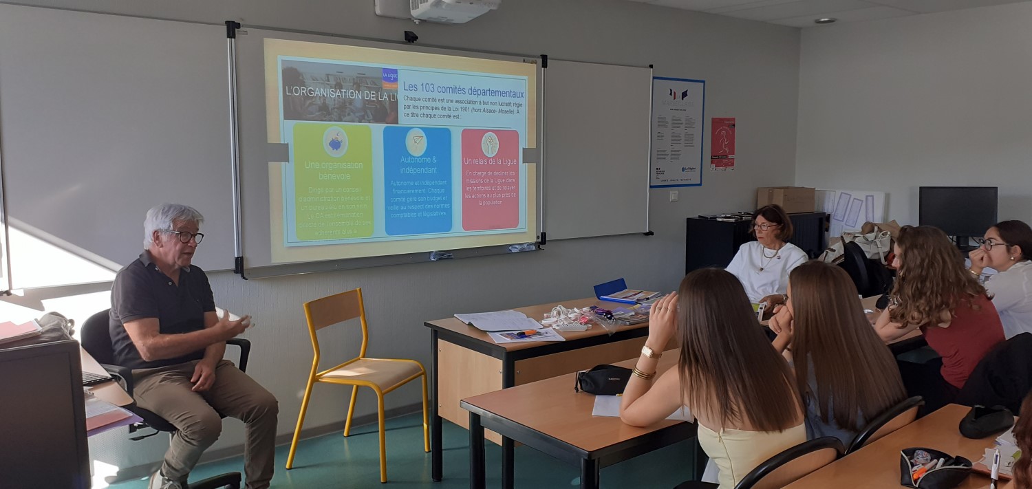 Dans le cadre d’un projet pédagogique concernant les politiques et les actions mises en place pour lutter contre les cancers, les élèves de TST2S ont eu le plaisir de rencontrer des représentants de l’association «la ligue contre le cancer ».