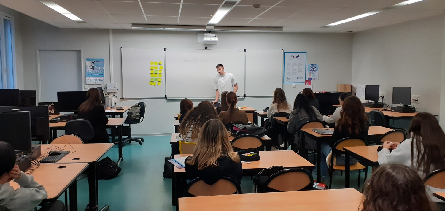 Après avoir fait réfléchir les élèves à la notion d’animation sociale, Thomas a présenté les enseignements théoriques qu’il suit : sociologie, psychologie du développement, anglais, démarche de projet …