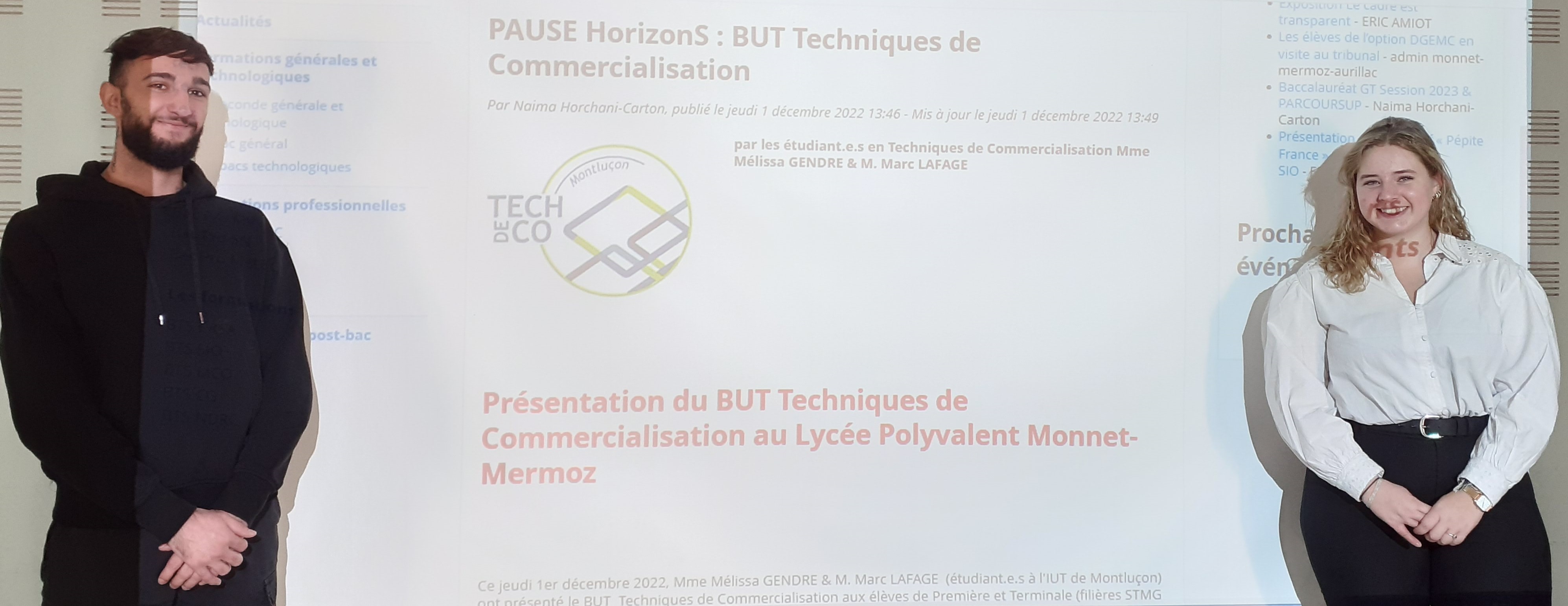 Ce jeudi 1er décembre 2022, Mme Mélissa GENDRE & M. Marc LAFAGE (étudiant.e.s à l'IUT de Montluçon) ont présenté le BUT Techniques de Commercialisation aux élèves de Première et Terminale (filières STMG et Générale).
